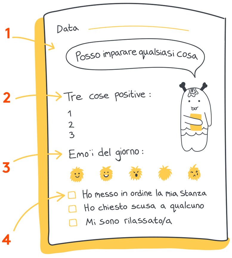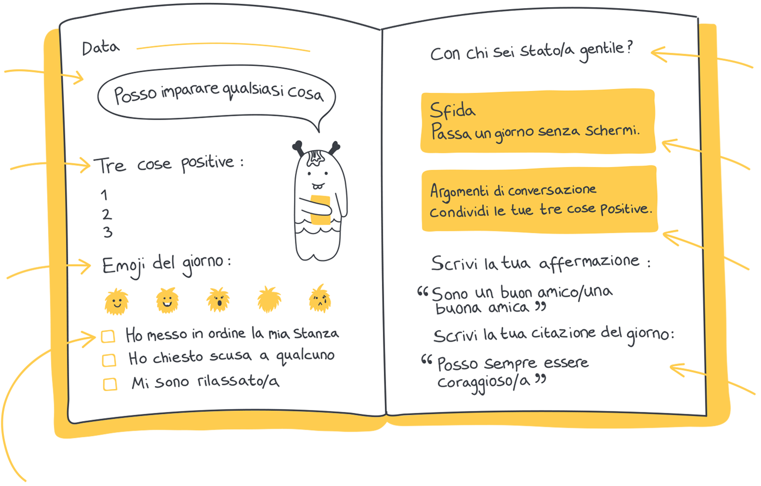 Tenere un diario della gratitudine è una delle pratiche di felicità più consolidate e più semplici da attuare. Praticare la gratitudine è un tema centrale del diario: i bambini sono invitati a riflettere su tre aspetti positivi successi durante la giornata. La ricerca ha dimostrato che praticare la gratitudine attraverso un diario aumenta il senso di felicità oltre a favorire una serie di benefici fisici, psicologici e sociali.